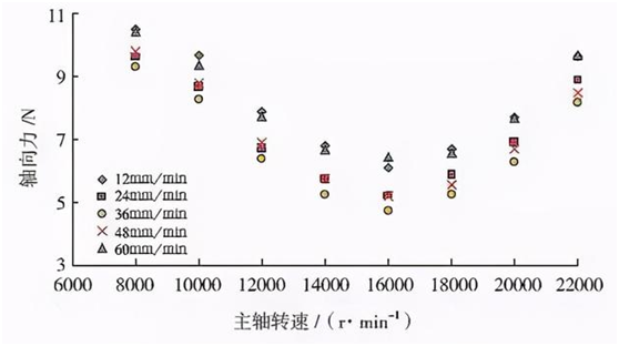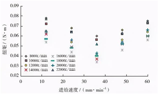 如圖分別為不同主軸轉速下改變進給速度時鋁合金微小孔鉆削加工中軸向力和扭矩試驗數據的匯總圖。同樣,總體的趨勢是:隨著進給速度增加,軸向力和扭矩逐漸減小;進給速度為36mm/min 時,軸向力和扭矩最小;之后,隨著進給速度增加,軸向力和扭矩又開始逐漸增大。上述規律并不因為主軸轉速的不同而改變。