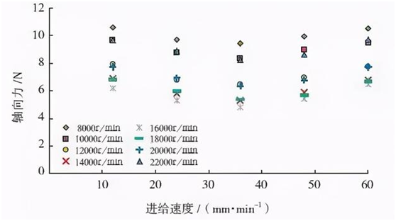 2 進給速度對鉆削力的影響規律:進行鋁合金微小孔鉆削試驗,在8000r/min、10000r/min、12000r/min、14000r/min、16000r/min、18000r/min、20000r/min 和22000r/min 的不同主軸轉速下考察進給速度對鉆削軸向力和扭矩的影響。進給速度為12~60mm/min。